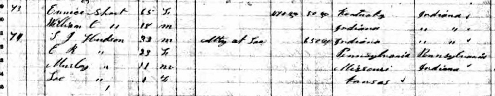 | 1875 | Fredonia, KS (HV 17) | Isaac Hudson | 28 | IN IN | Living alone; banker | ||