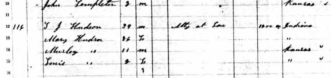 | 1875 | Fredonia, KS (HV 74) | T. J. Hudson | 33 | IN IN | Atty at law; Living with E.R. (age 23), Murley (age 11), Loe (age 1) | ||