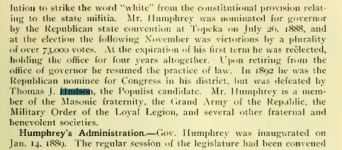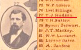| 1875 | Fredonia, KS (HV 116) | T. J. Hudson | 34 | IN CA | Atty at law; Living with Mary Hudson (age 26?), Murley (age 11), Louis (age 2) | ||