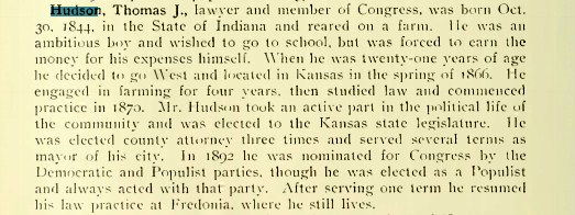 | 1880 | Fredonia, KS | Thomas J. Hudson | 39 | IN KY - | Lawyer, living with Emma R., Merlin, Emma's 4 living children, Emma's mother. | ||