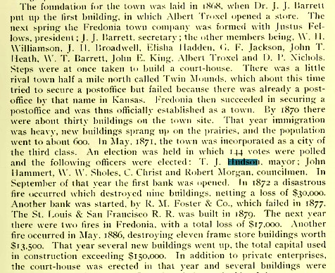 | 1880 | Fredonia, KS | Isaac Hudson | 35 | IN KY KY | cashier of bank, living with Louisa 27 (wife) KS OH MO;